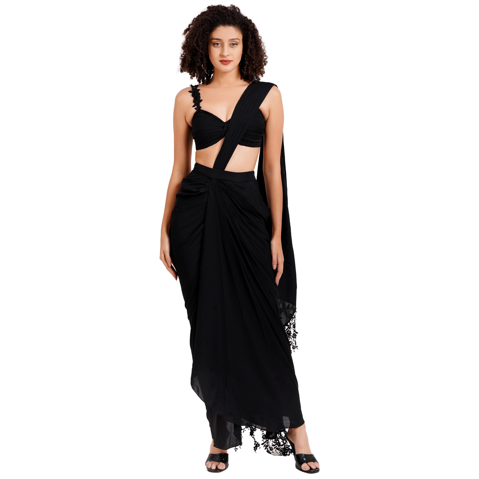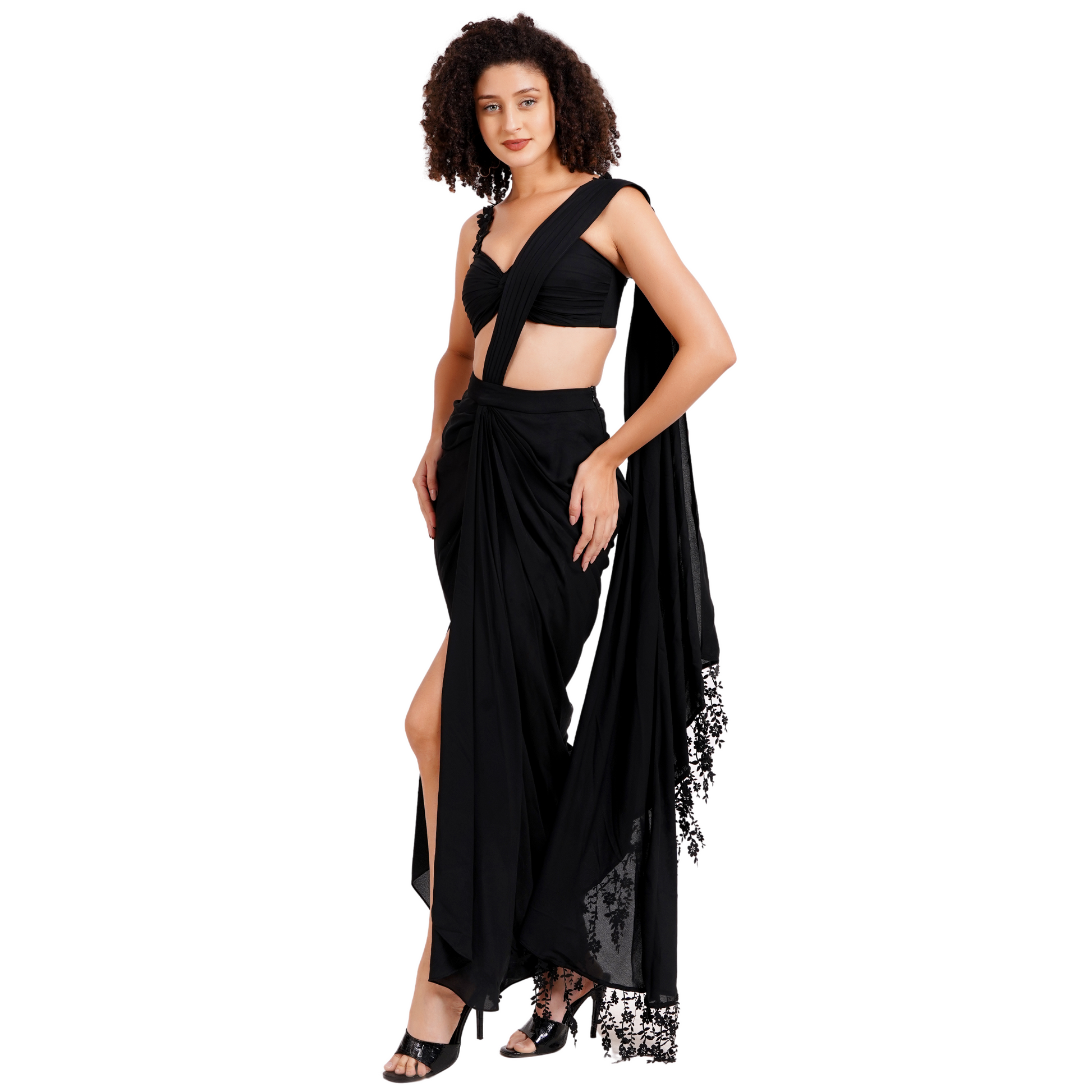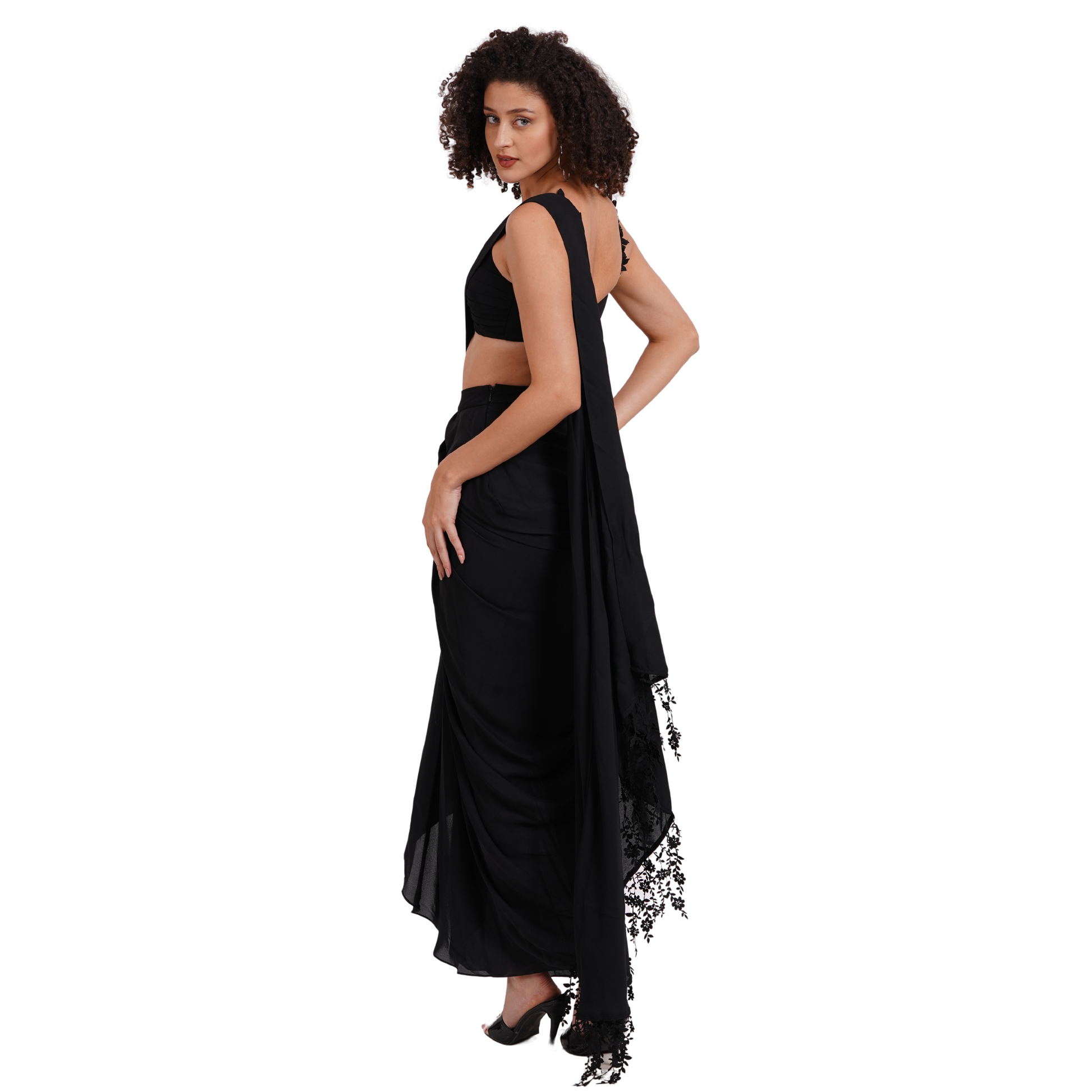 The pallu is adorned with intricate laser-cut applique work, adding depth and texture to the saree, making it a true work of art. The rich, deep black color enhances the saree’s luxurious feel, perfect for evening events or special occasions.