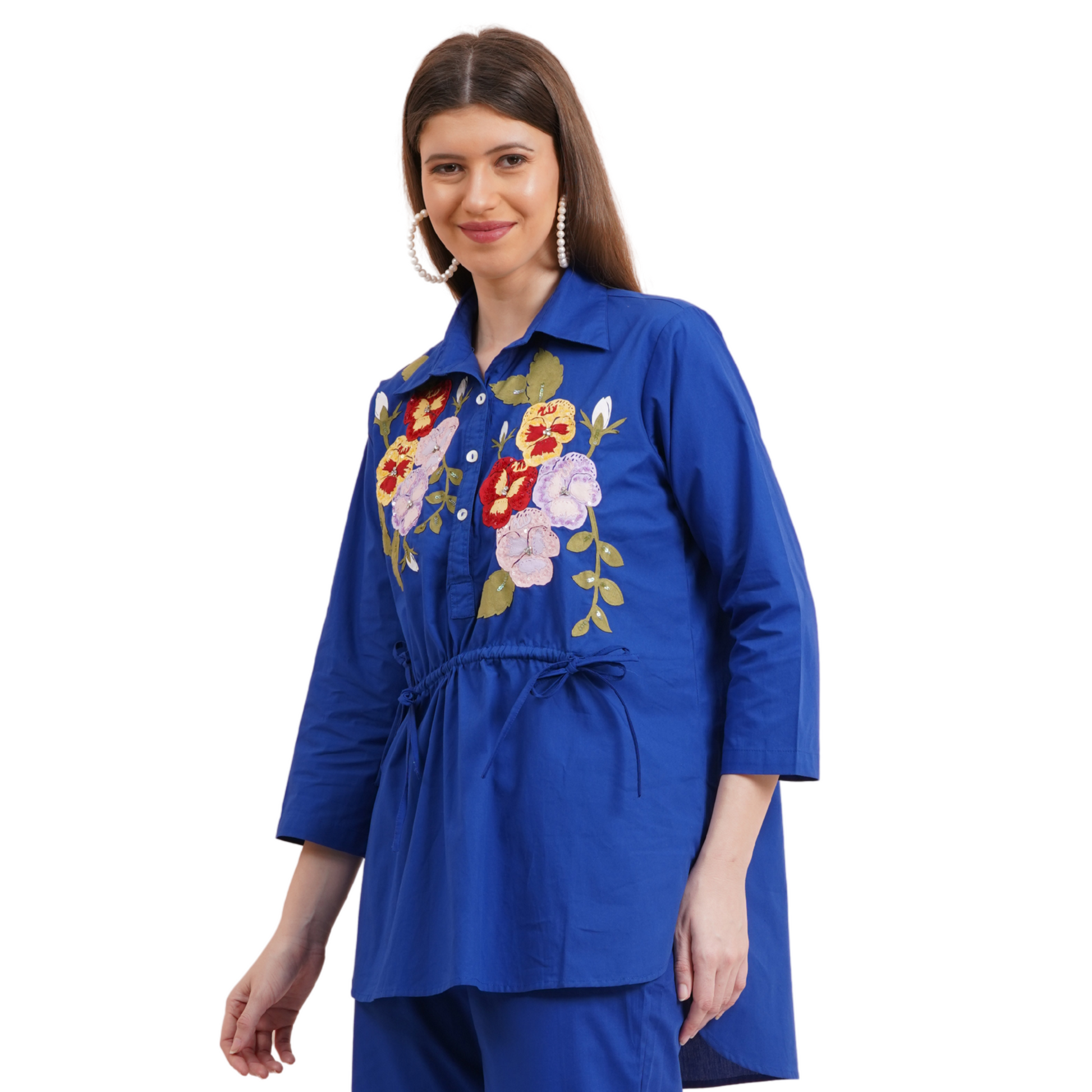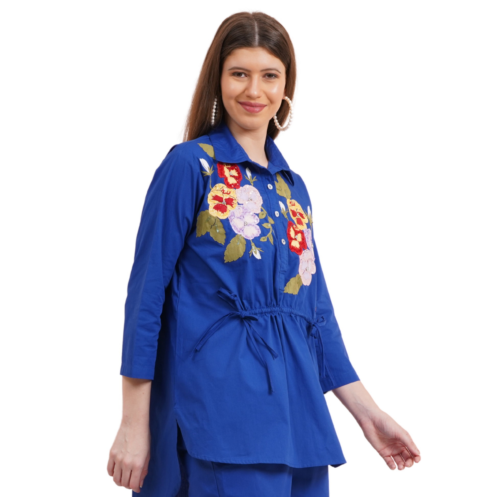 Description: The Persian Blue Shirt features beautiful pansy embroidery and adjustable gathers with a drawstring, allowing for a custom fit. It combines comfort and elegance, offering a stylish and flattering look perfect for both casual and semi-formal occasions.