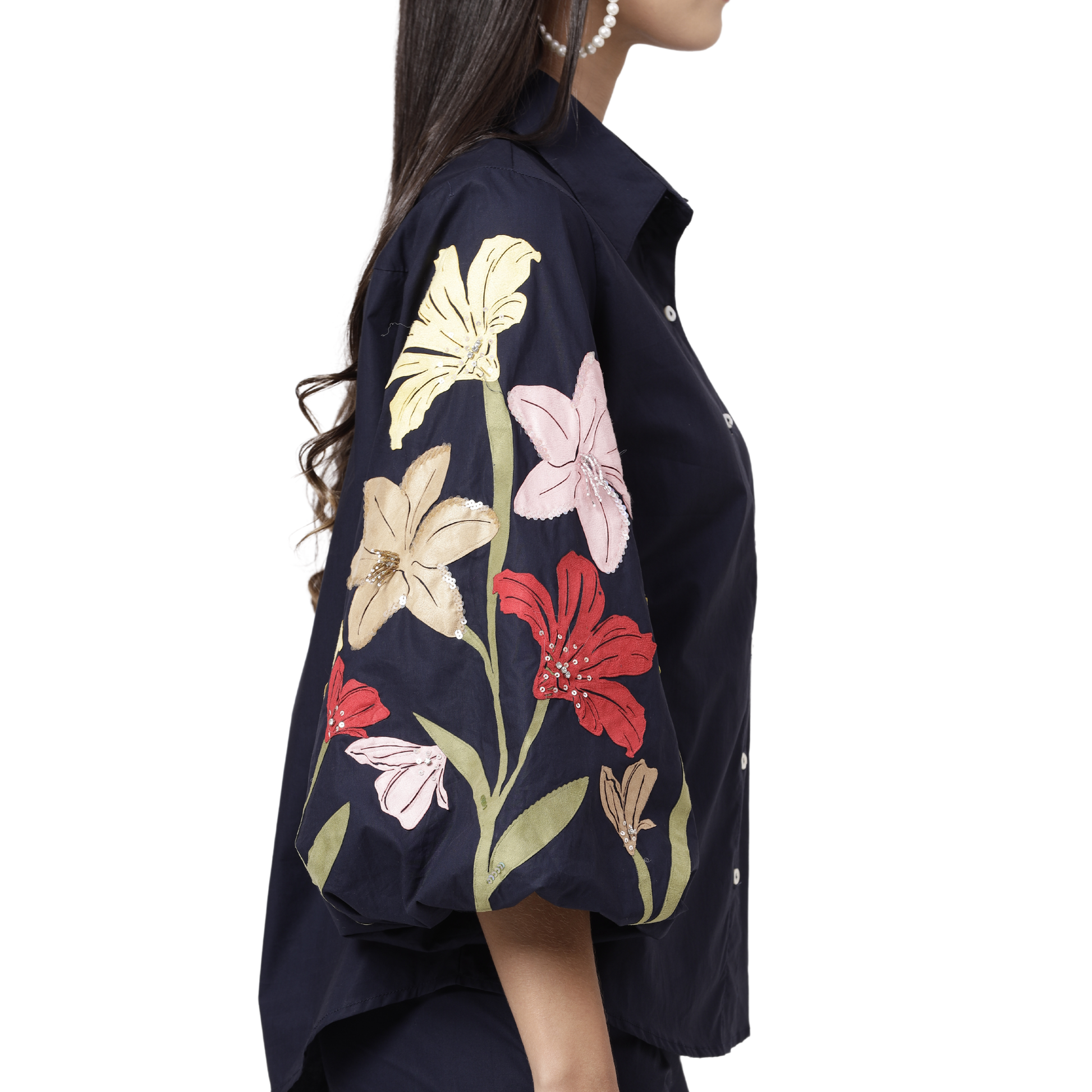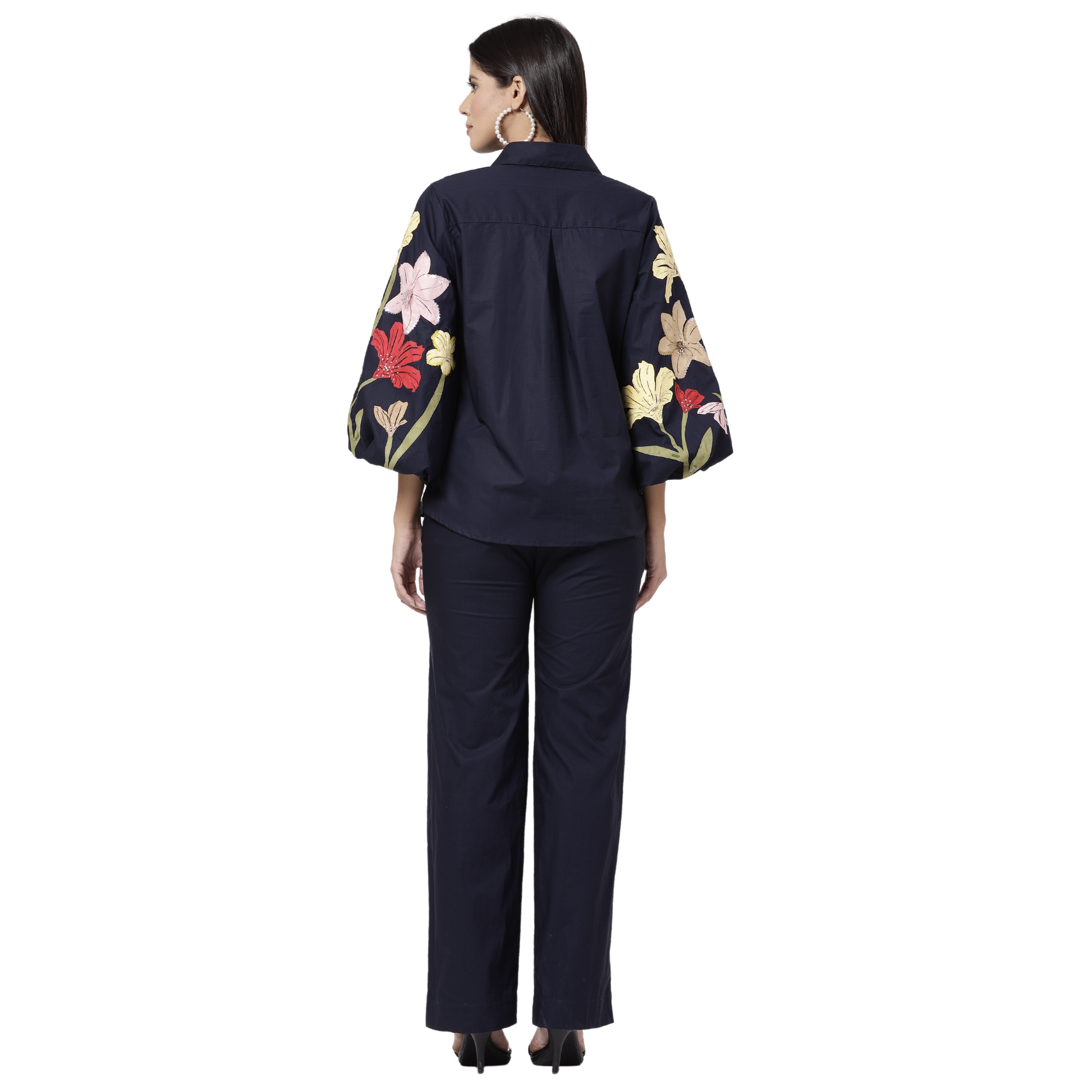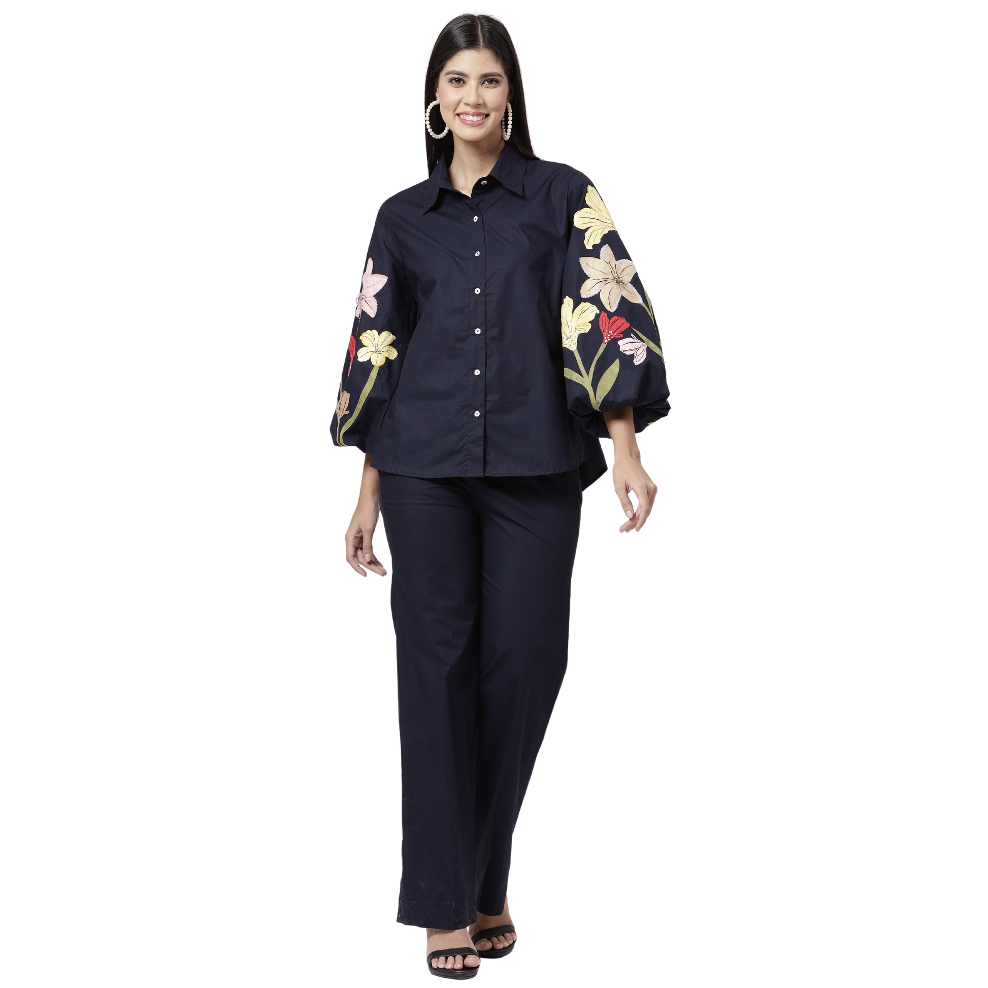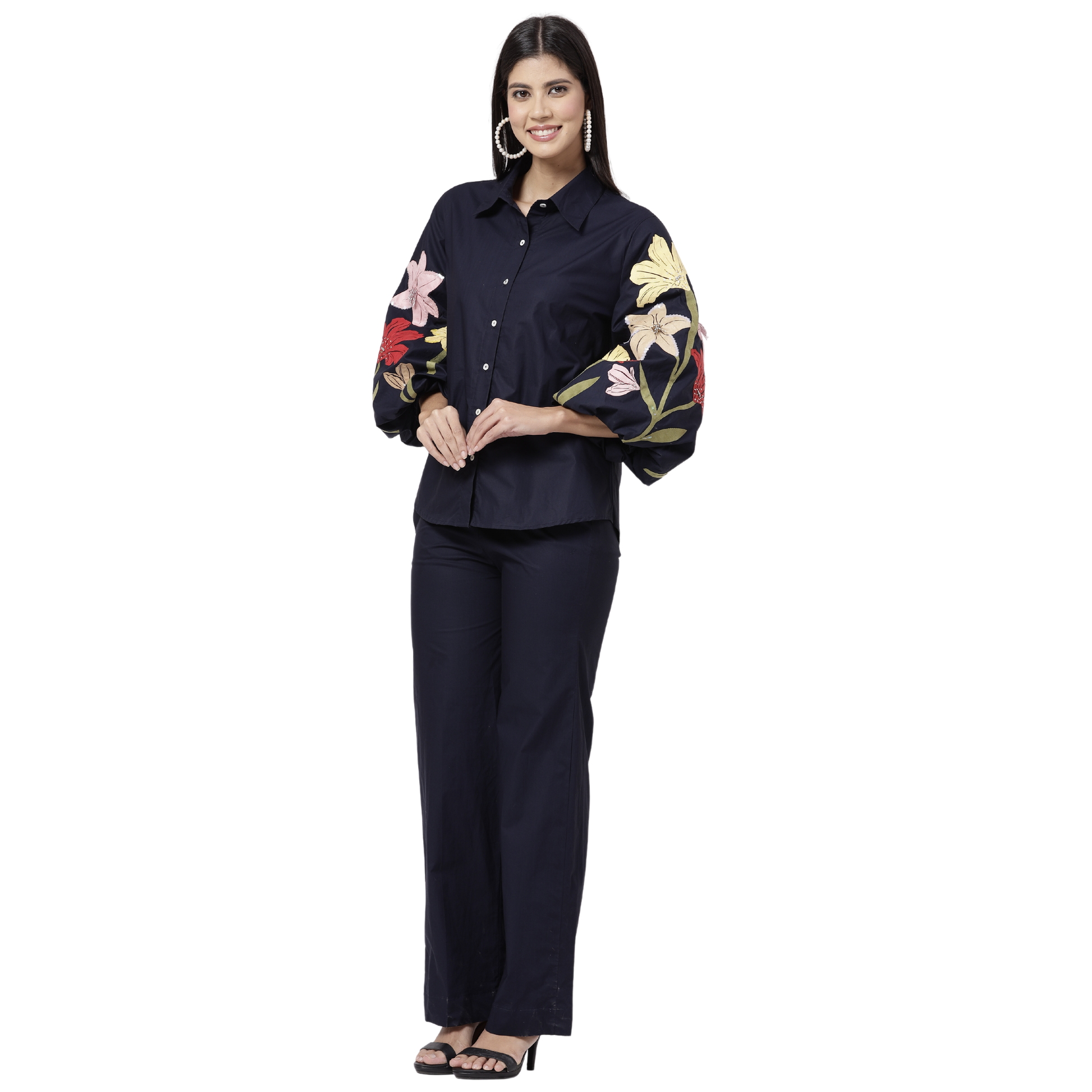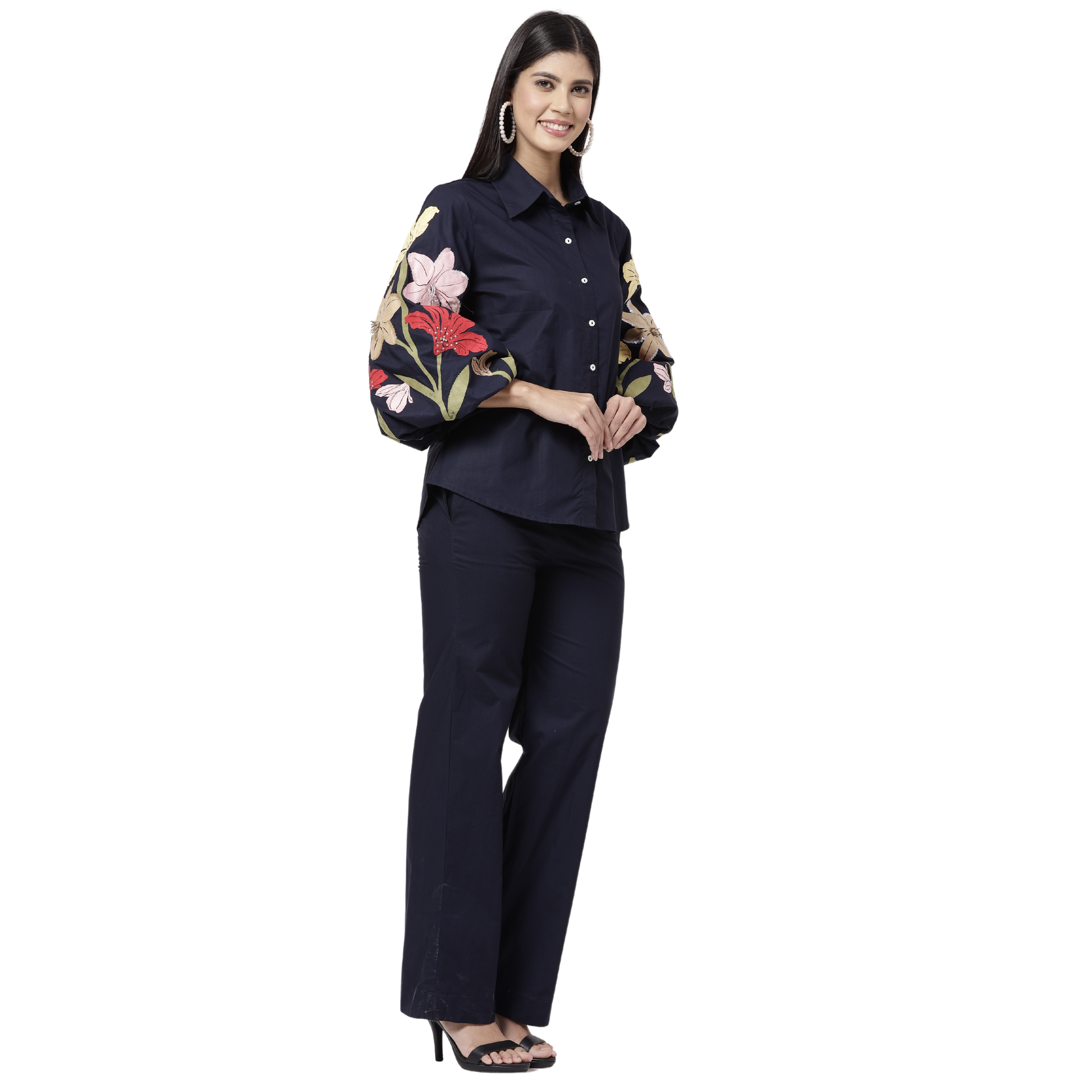 Description: This chic navy blue co-ord set features stylish balloon shirt paired with sleek slit pants, all beautifully embroidered with multicolor hibiscus flowers. Perfect for a trendy yet comfortable look, it adds a splash of color to any ensemble.