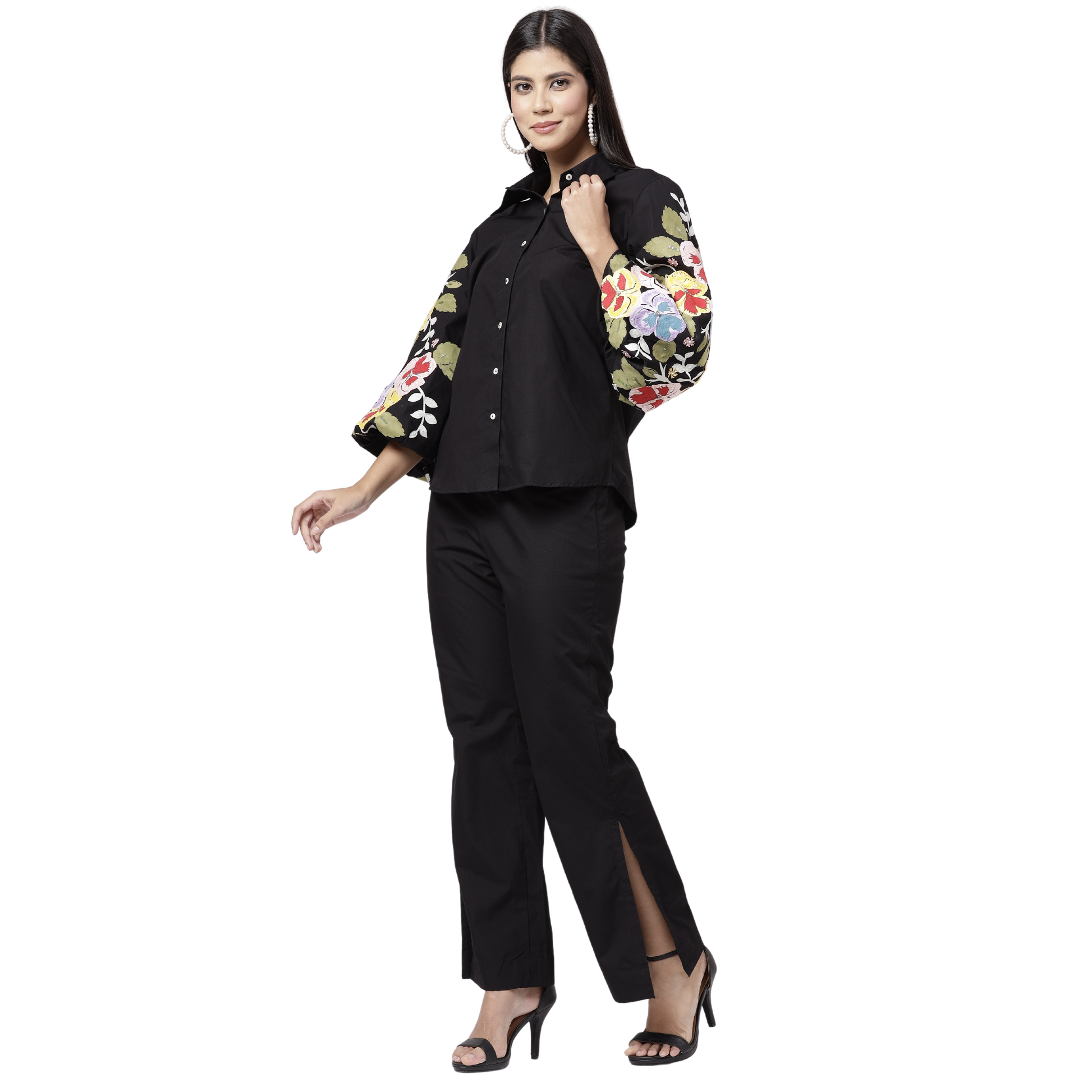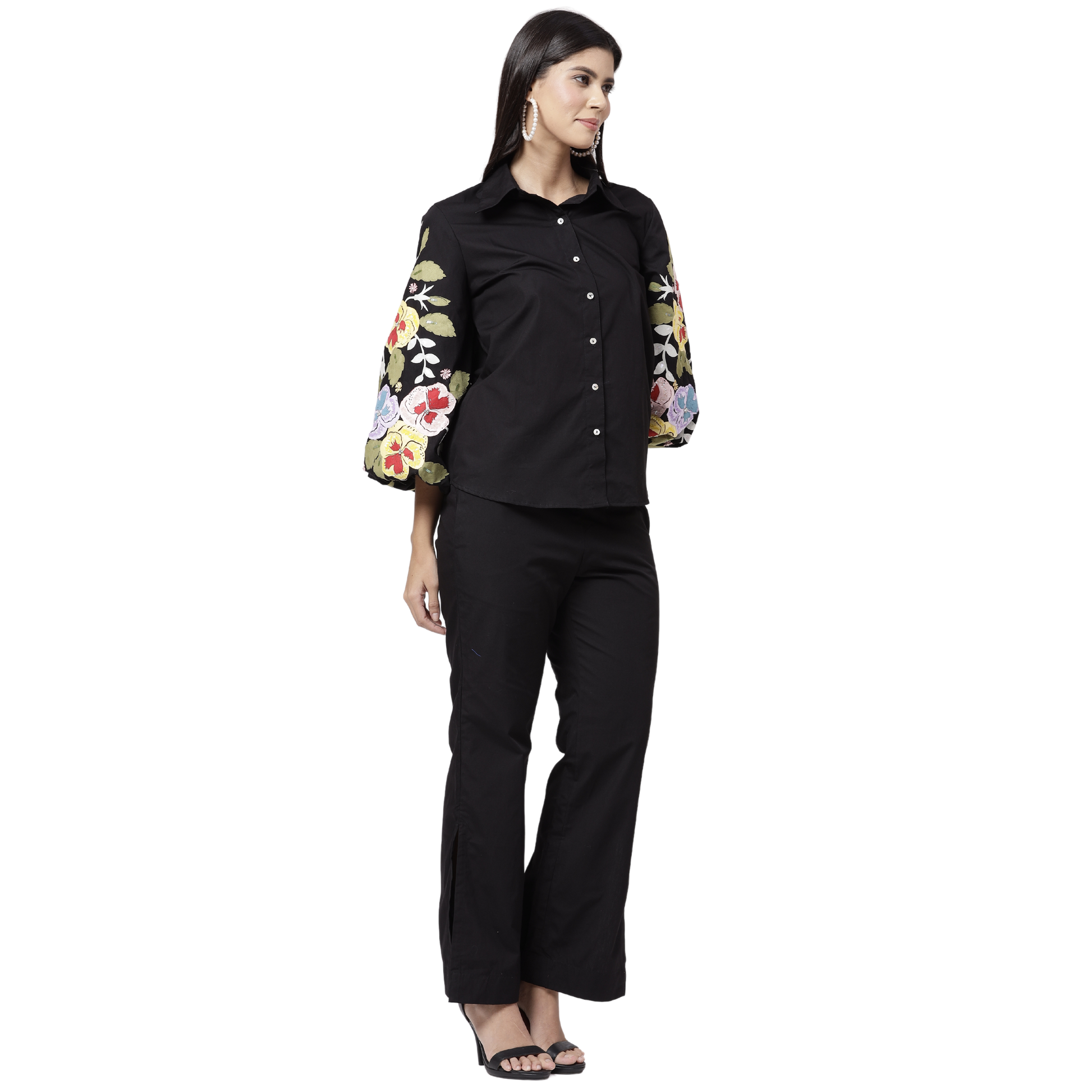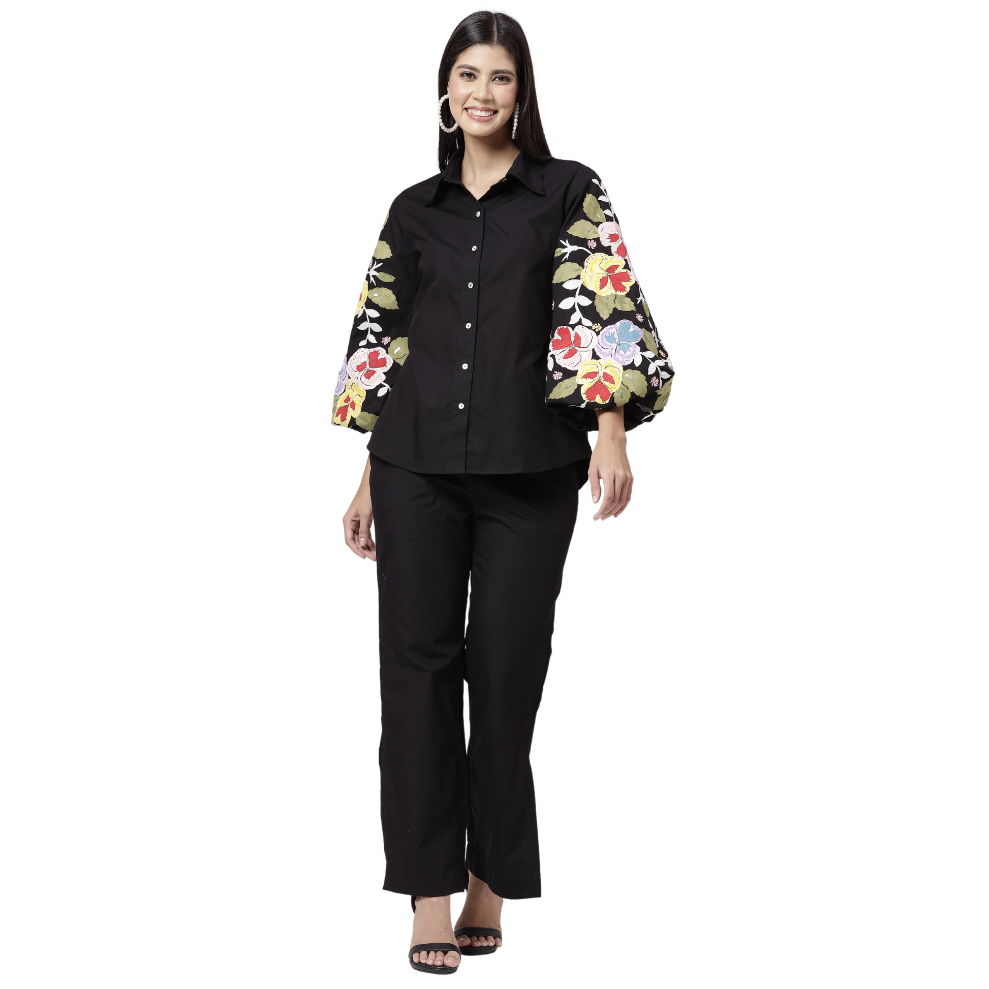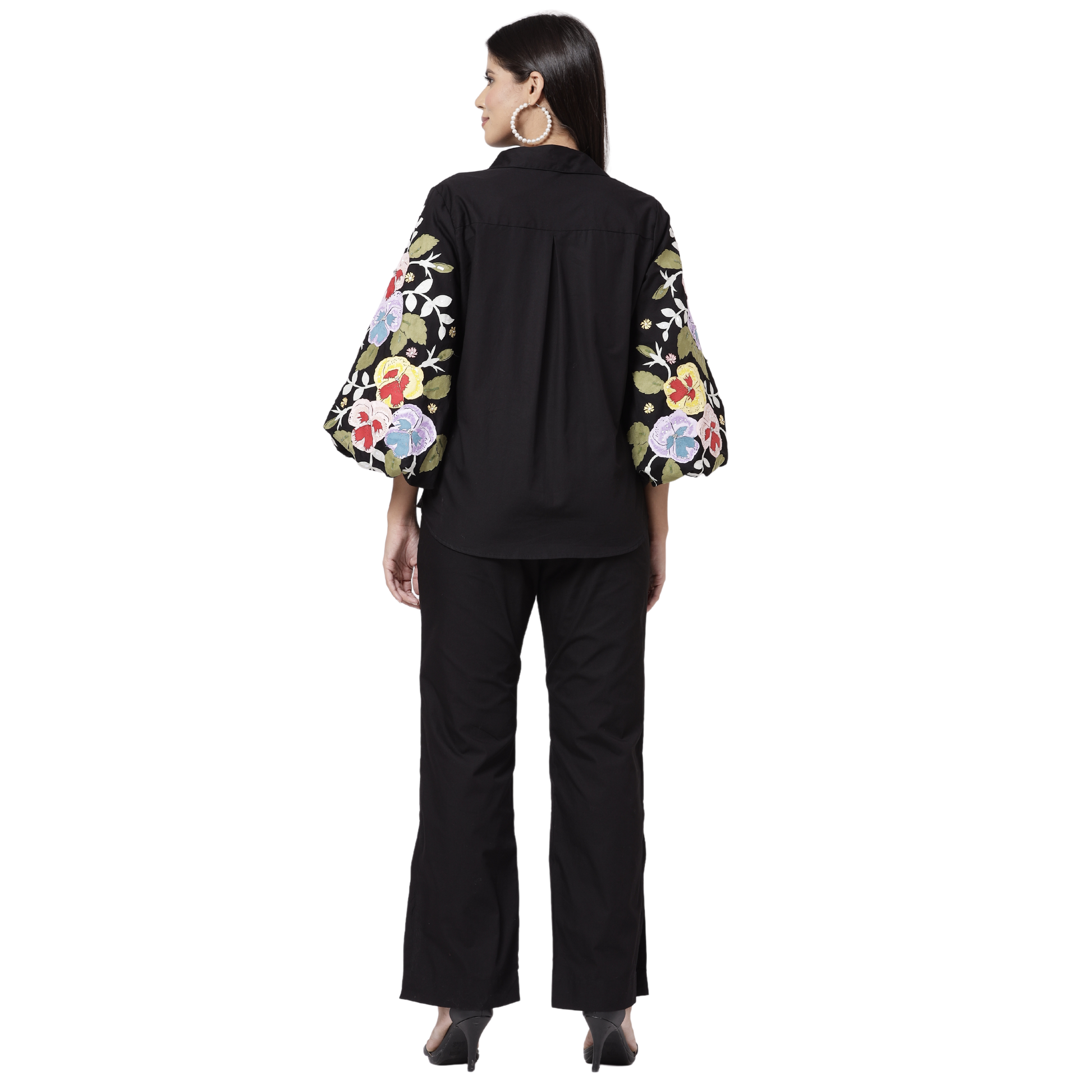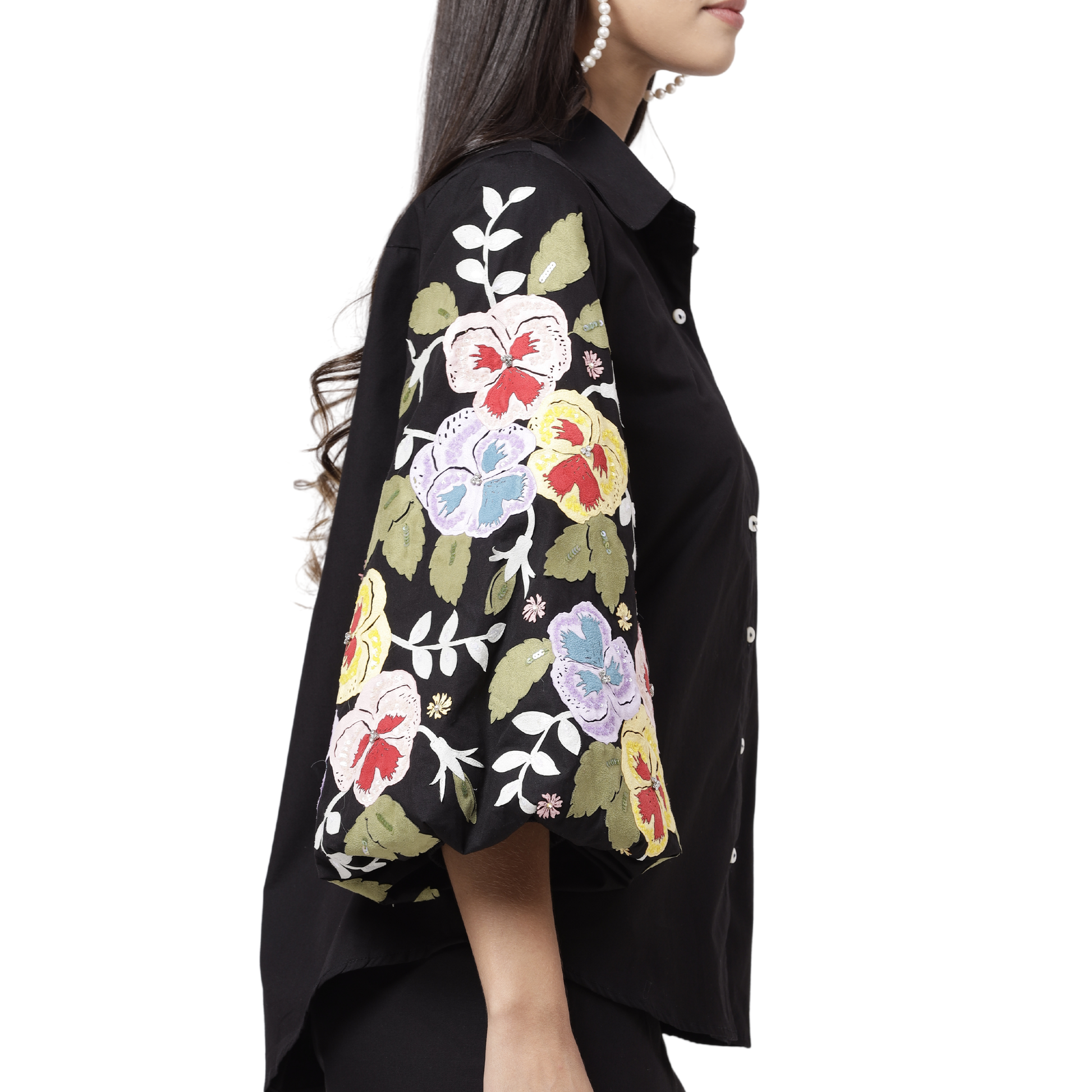 Description: This striking black shirt features stylish balloon sleeves and vibrant multicolor pansy embroidery, making it a standout piece in our collection. Perfect for adding a bold touch to any outfit, it combines elegance with a playful twist.