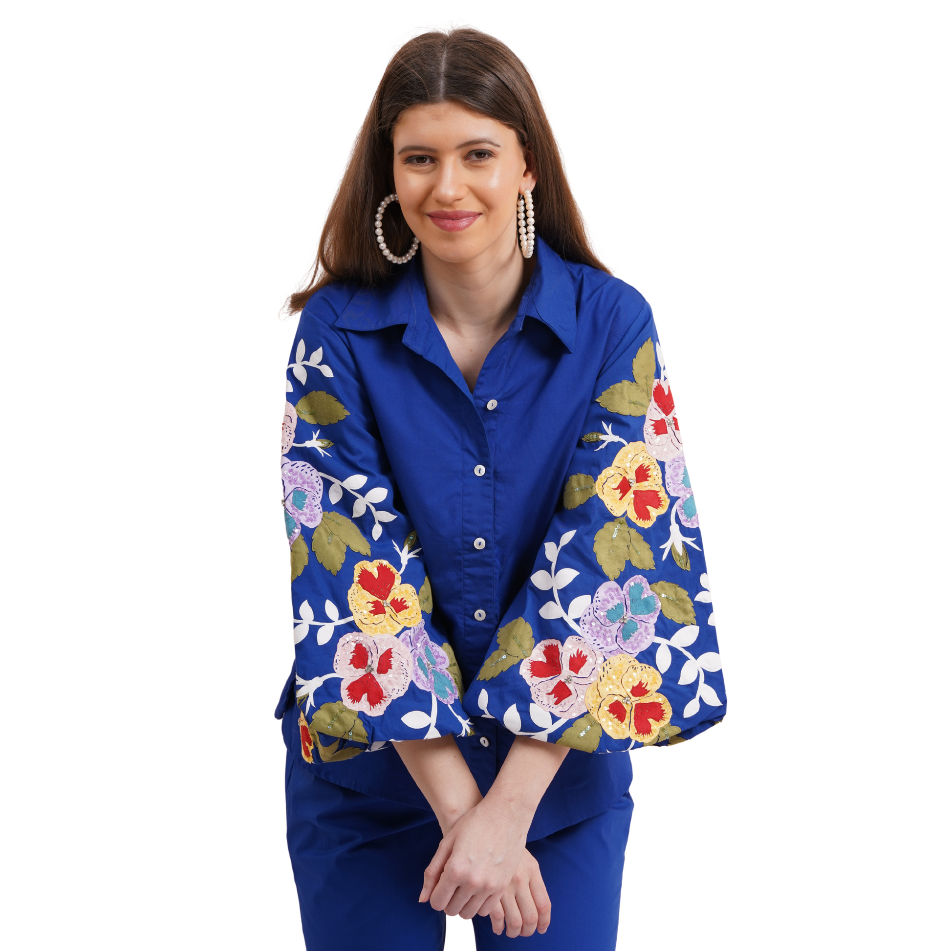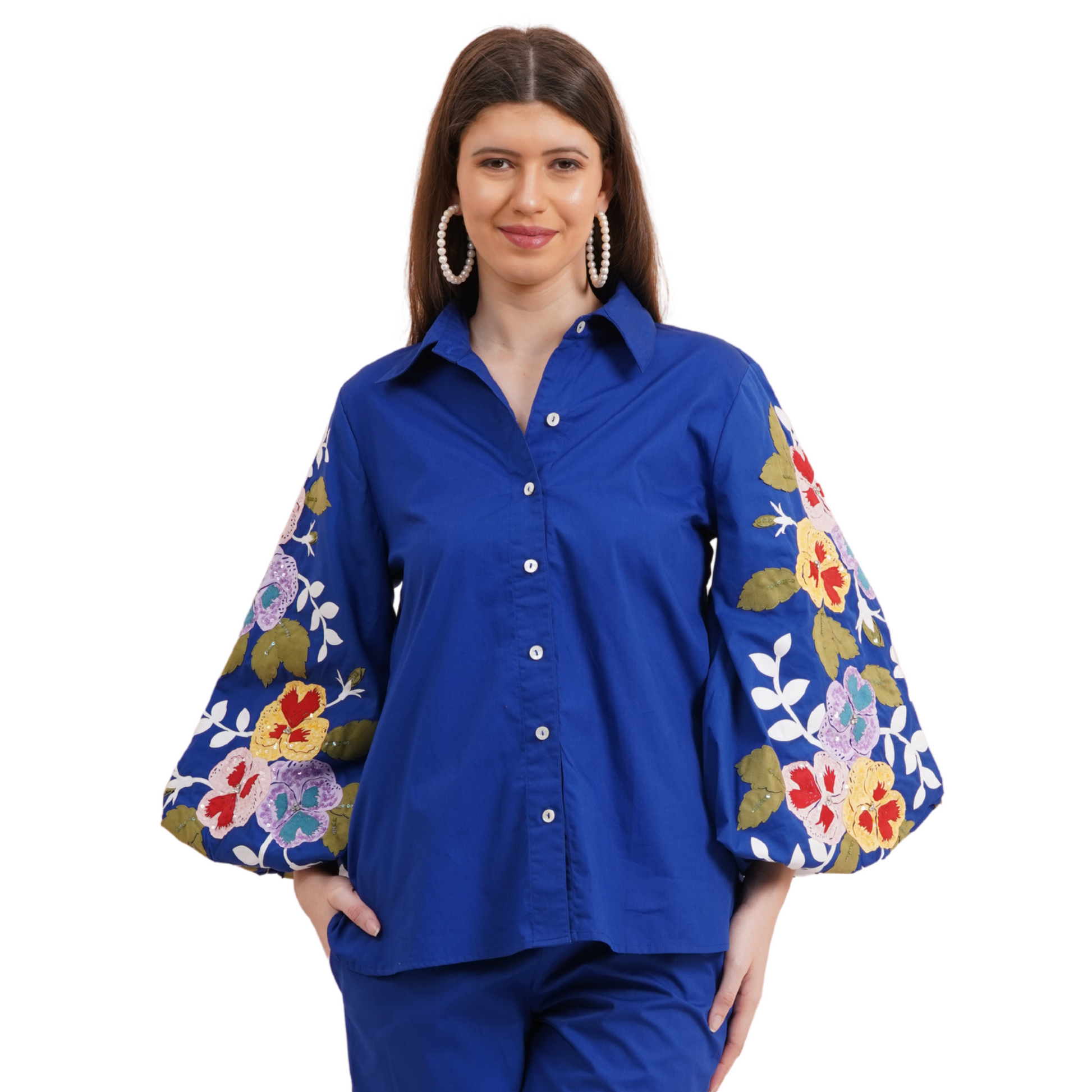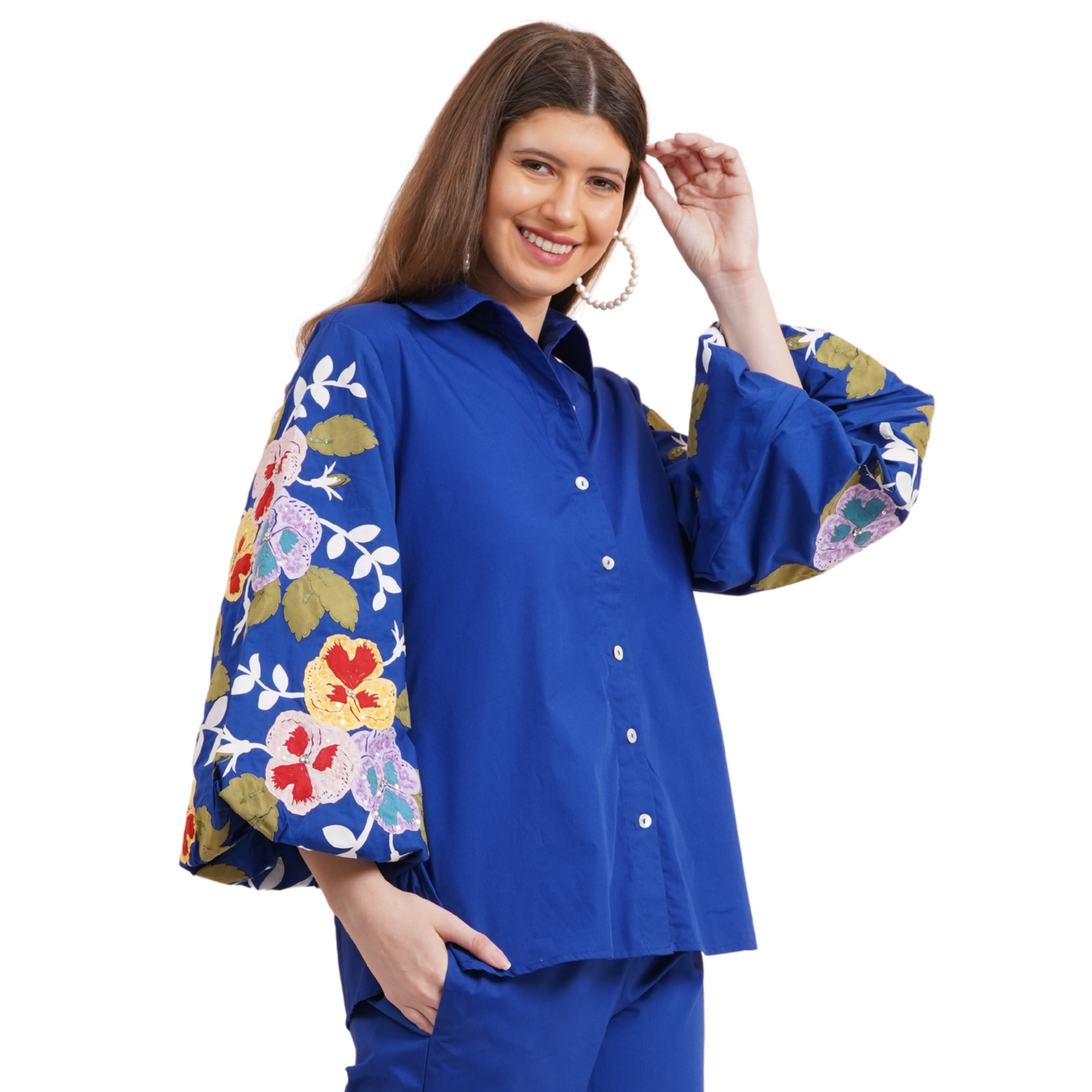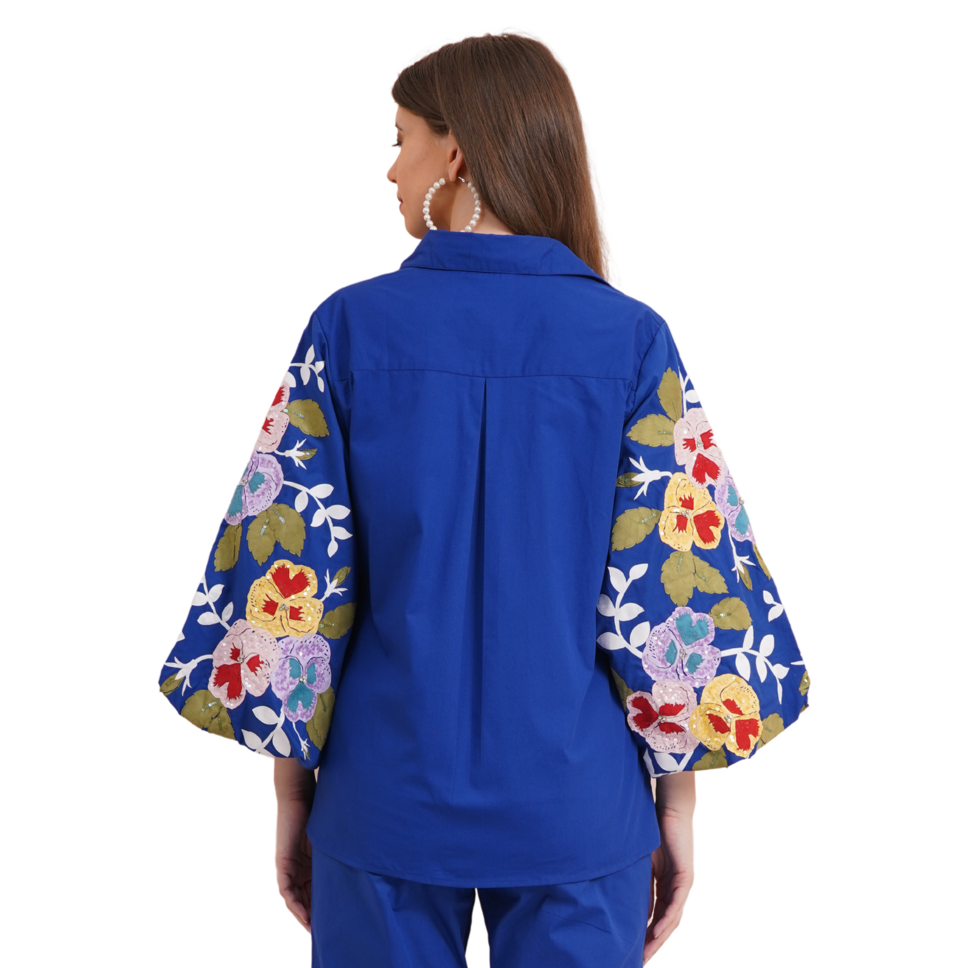 Description: This striking persian blue shirt features stylish balloon sleeves and vibrant multicolor pansy embroidery, making it a standout piece in our collection. Perfect for adding a bold touch to any outfit, it combines elegance with a playful twist.
