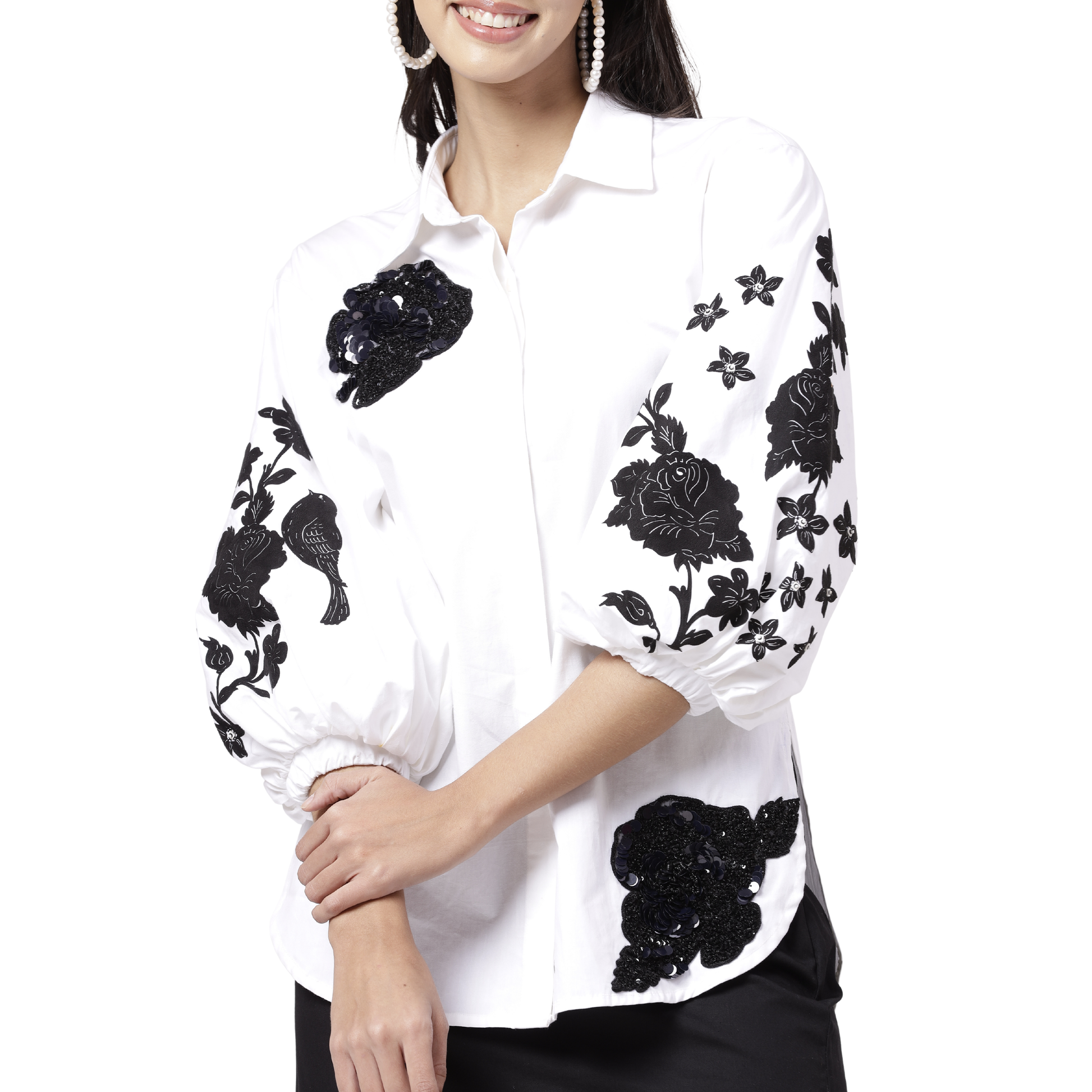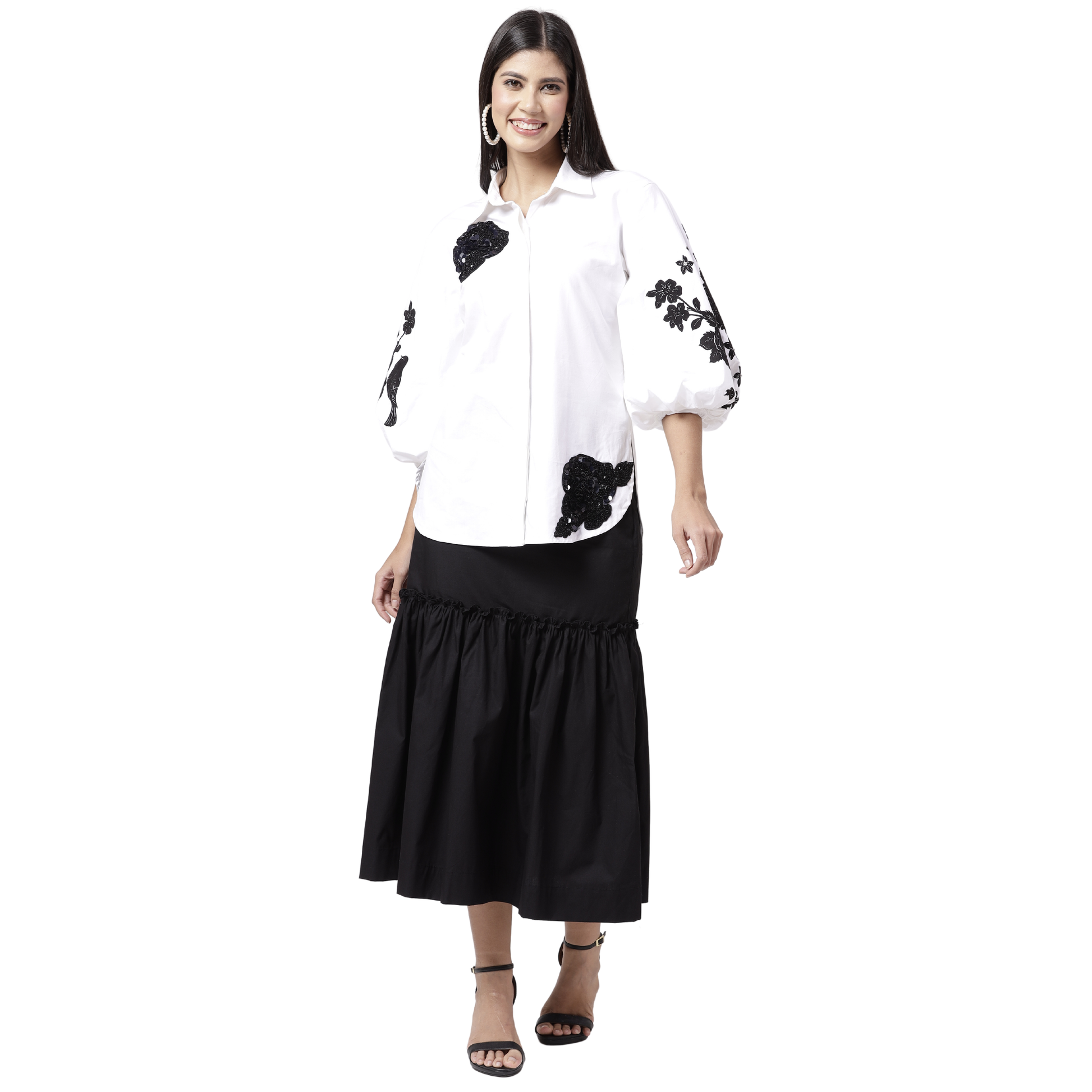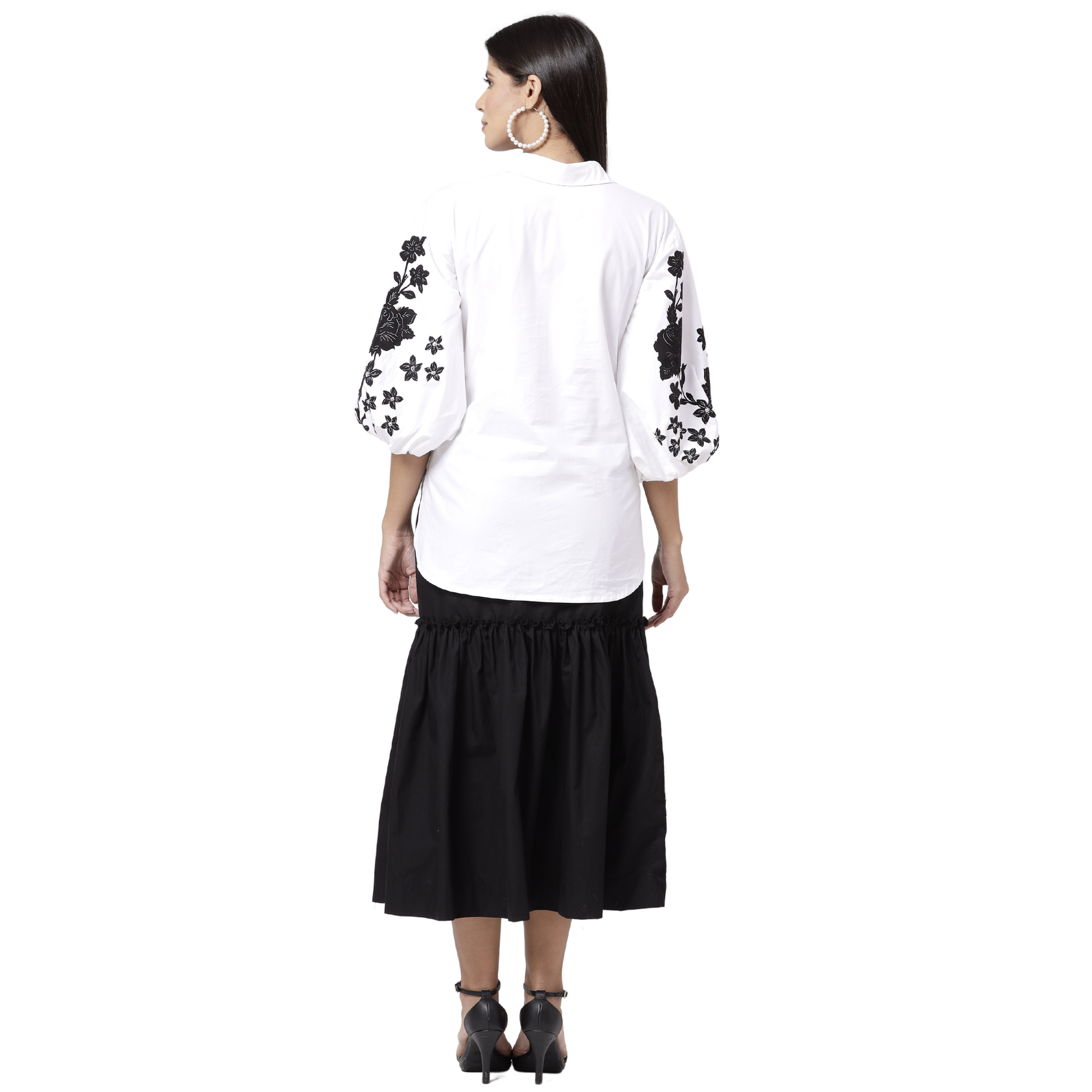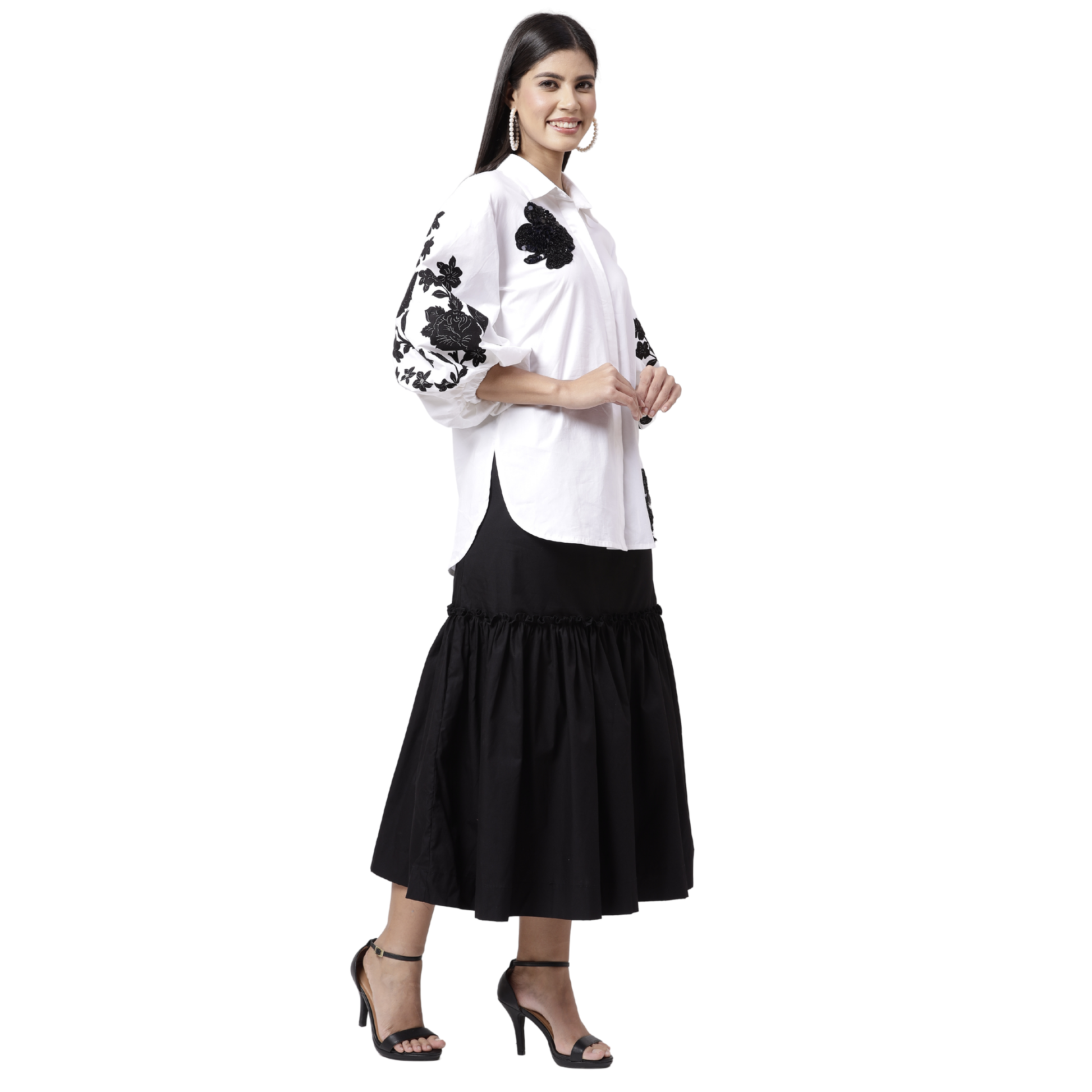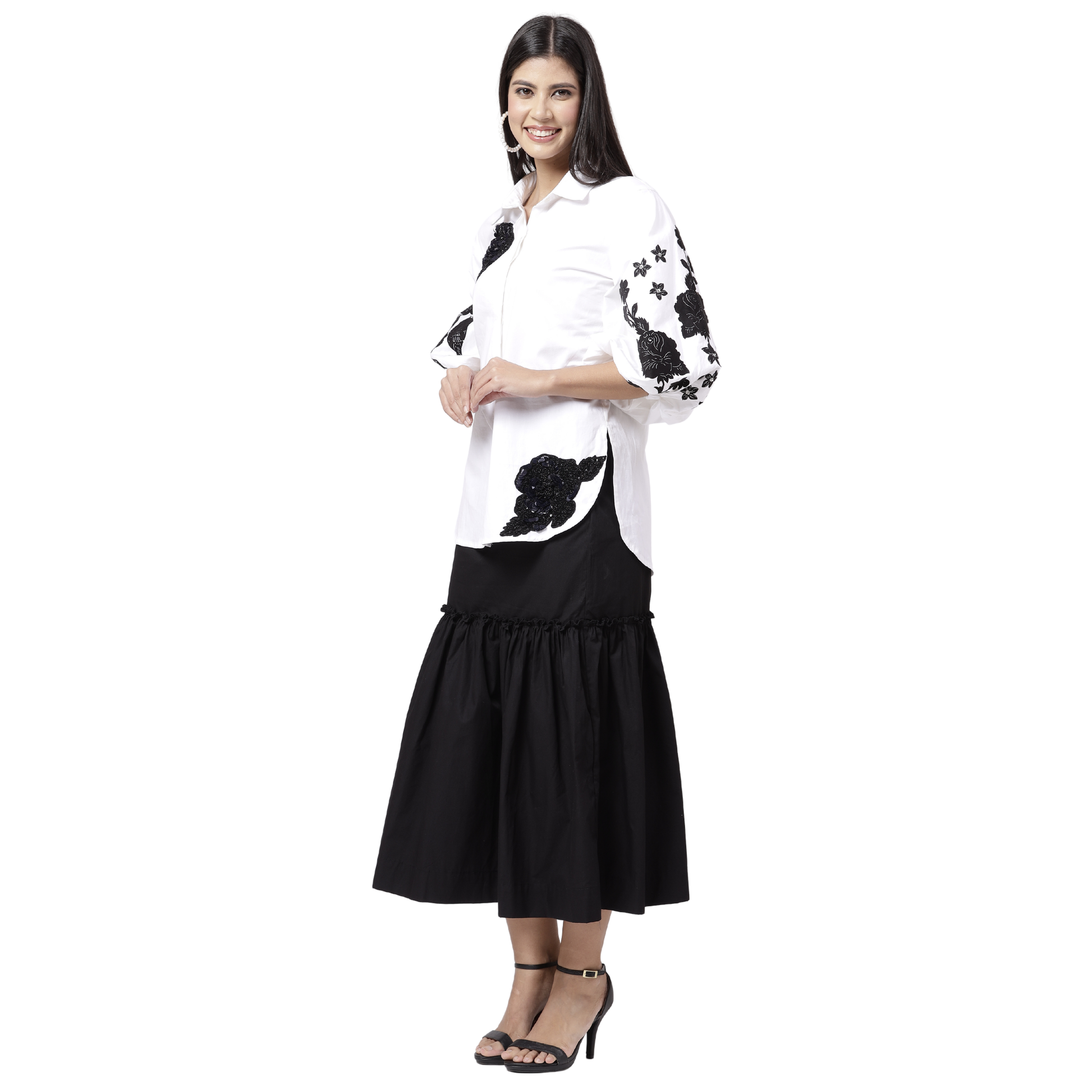 Description: Elevate your style with this sophisticated skirt set featuring a crisp white shirt adorned with exquisite black rose laser-cut embroidery. Paired with gathered black skirt, this ensemble perfectly balances elegance and modernity, making it ideal for both casual outings and dressier occasions.