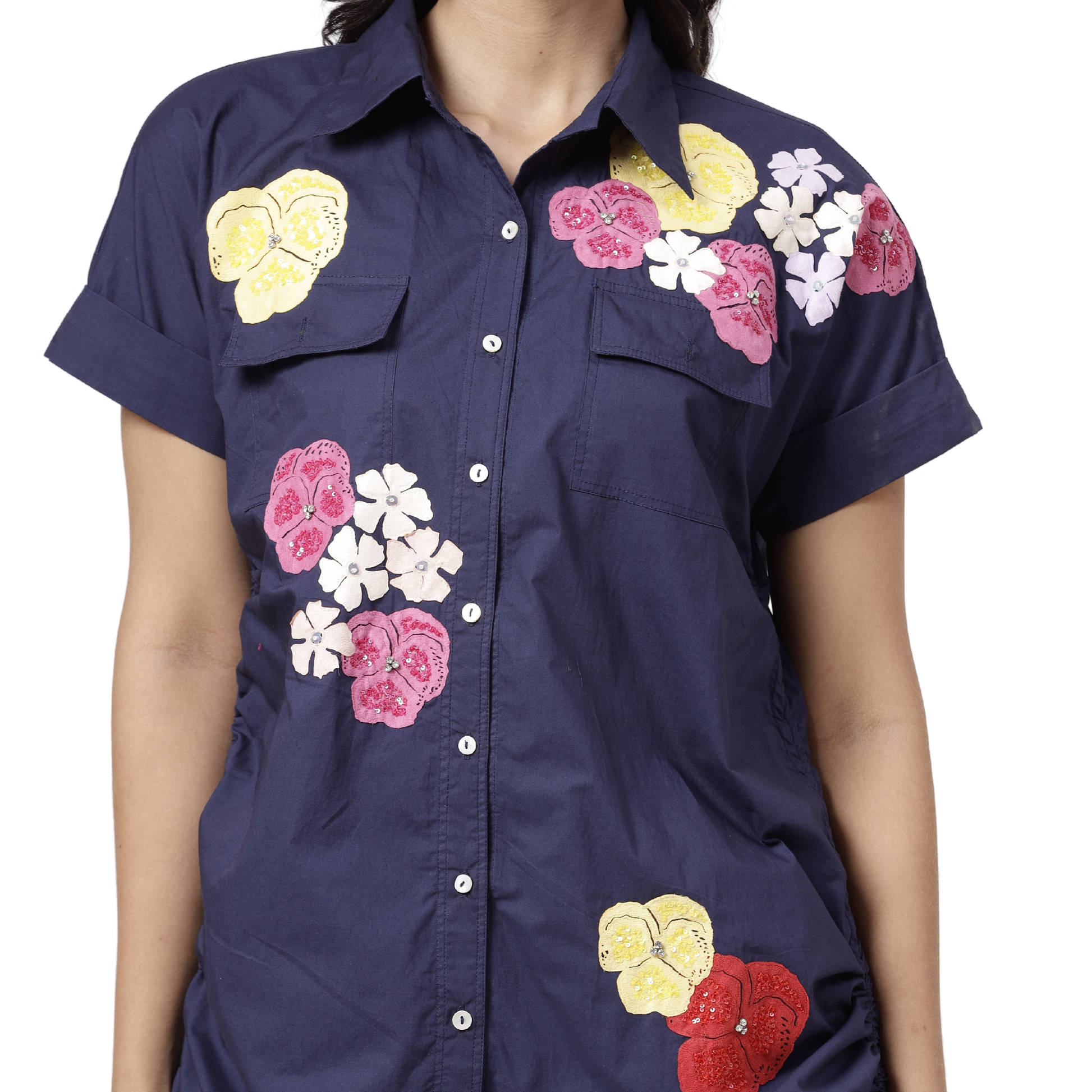 Description: This beautiful navy dress features a side tie-up detail and is adorned with scattered multicolor pansy flower embroidery. Its versatile design makes it perfect for both casual outings and special occasions, offering a fresh and feminine touch.